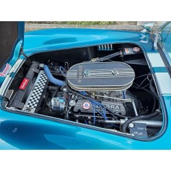 - Le V8 Ford Windsor Small block se présente avec touts les gimmicks visuels du style Shelby cobra. Néanmoins, une part de mystère demeure quant à la cylindrée exacte (289 ou 302 / 4,7 litres ou 5 Litres ). D’après l'ancien propriétaire ce serait un 289 ci ?????…mais extérieurement rien ne les distingue : Dans l’absolue , 300 cm3 de plus ou de moins, cela n'a que peu d’influence sur ce type de moteurs américains dont le cubage est de plusieurs milliers de Cm3 . En revanche, la présence des bonnes culasses aluminium signées Edelbrock est prépondérante en matière de performance; surtout selon l'adage des motoristes qui disent que : ‘' Les culasses font le moteur ‘’ .